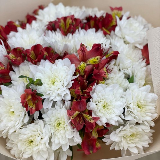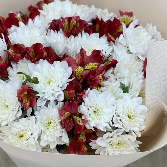 Букет из белых хризантем и альстромерий